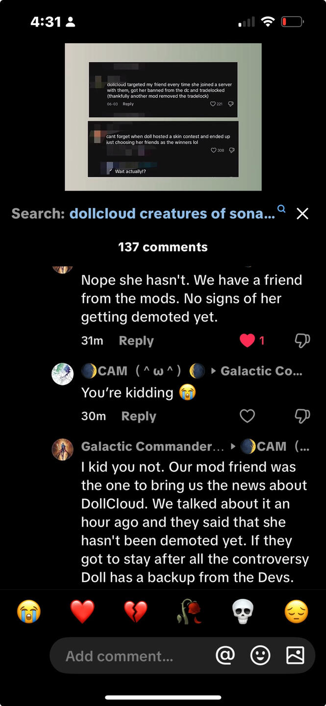 As of now, Dollcloud has stepped down from moderation and CC for her own safety and mental-health.A moderator confined in a friend about Dollcloud, and that friend shared on TikTok: